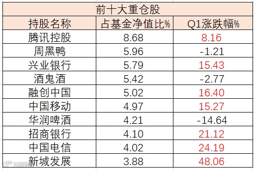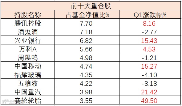 前十大重仓股合计占基金净值比为53.18%,2021Q1前十大重仓股60%为正收益,其中赛轮轮胎涨幅高达49.50%。