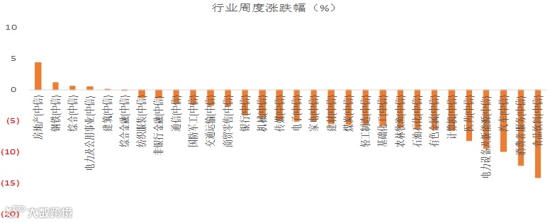 跌幅前三名行业为食品饮料、消费者服务和汽车。
