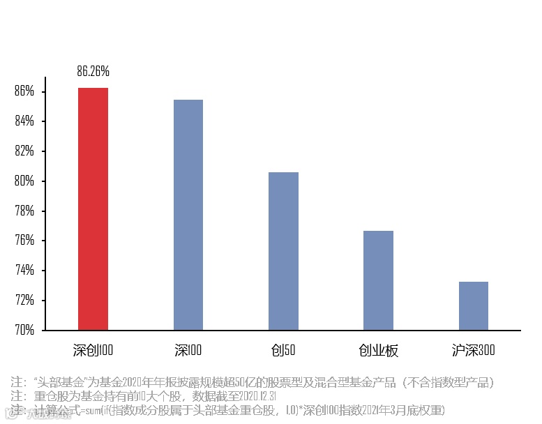 值得一提的是,深创100指数成分股均为细分行业领军者,权重股获机构资金高度青睐,市场认可度较高。成分股中属于头部基金重仓股的权重占比超86%,大幅高于其他宽基指数。
