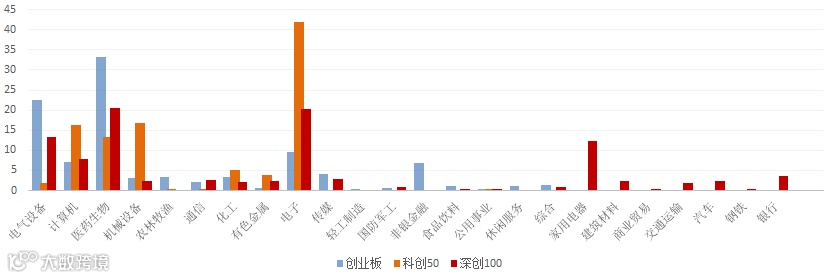 从指数成分股看,两者仅有49个成分股相同,剩余51个成分股深创100主要集中在新兴产业。