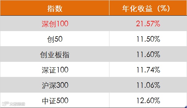 深创100基日以来(2013.1.1)年化收益21.57%,超越同期创50、创业板指、深证100、沪深300等主流宽基指数。得益于独特的成长蓝筹风格,深创100也是上述主流宽基中唯一一个复合年化收益超20%的指数。