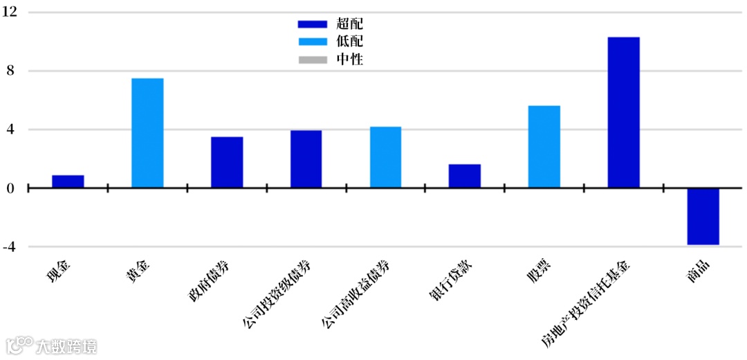 基于我们对未来12个月回报的预测,我们的资产配置将更加偏向防御性,尽管我们不想过于极端。因此,我们增加了对某些防御性资产(政府债券和投资级债券)的超配,同时将房地产和大宗商品的持仓调整至中性。
