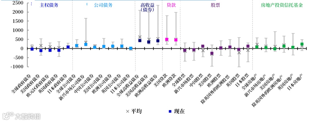 注:过去的业绩不保证未来的结果。*数据截止到2024年8月30日。“主权债务”指的是10年期国债收益率减去3个月政府利率。“公司债务”是指投资级债券收益率减去当地政府债券收益率。“HY”是指高收益债券收益率减去当地政府债券收益率。“贷款”是指银行贷款的折扣幅度(3年期)。“股票”是指股息收益率减去当地政府债券收益率。“REITs”是指REITs的股息收益率减去当地政府的收益率。定义、方法论和免责声明请见附录。数据来源:彭博,瑞士信贷指数/瑞银,洲际交易所美国银行,富时罗素,伦敦证券交易所集团数据流和景顺全球市场策略办公室。