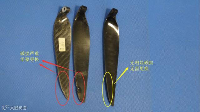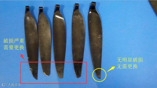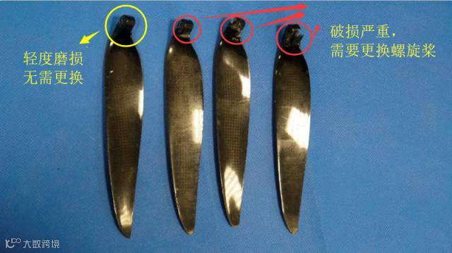 上图为螺旋桨的桨前缘不同程度的磨损,无人机降落时桨前缘与地面发生摩擦,导致螺旋桨前缘磨损严重。