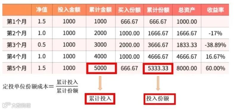 在第五个月,定投单位份额成本为:5000/5333.33=0.94元