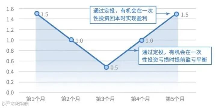 一次性买入与定投,主要就是交易方式的区别,它们各自适合不同类型的基金投资,货币基金这种低风险的基金可以选择一次性买入,但是指数基金、股票基金、混合基金等中高风险的基金则适合定投方式买入。在市场先跌后涨的过程中,如果选择一次性投资,标的的价格需涨到初始价格才可避免亏损,但在定投微笑曲线中,定投的盈亏平衡点远低于初始价格。