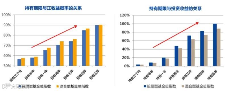 由上图可以发现,持有时间与获得正向收益的概率、平均收益率几乎都是正向关系。倘若频繁、短期地买卖基金会不断增加自己的交易成本;也会陷入到追涨杀跌的怪圈,错过中长期稳健收益。
