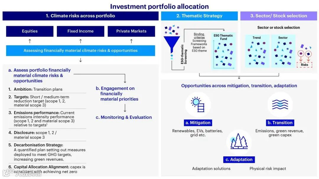 根据我们之前分享的《2024年亚洲ESG投资五大核心理念》文章(点此查看),投资者在考虑跨减缓、适应和转型领域的投资时,可以关注以下几点:
