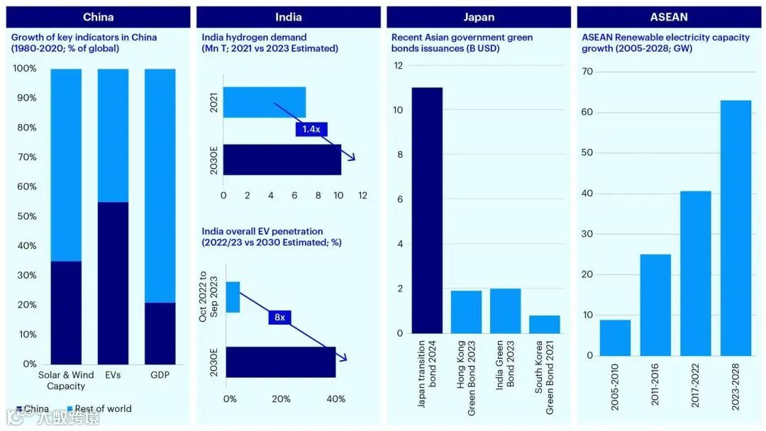 资料来源:IEA 中国能源部门碳中和路线图(执行摘要 - 中国能源部门碳中和路线图 - 分析 - IEA);IEA/伯恩斯坦分析;贝恩(2023年印度电动汽车报告 | 贝恩公司);CBI(日本将发行110亿美元气候转型债券,并获得气候债券标准认证 | 气候债券倡议);南华早报(香港将发行第二批零售绿色债券,价值191亿美元供居民于九月购买);CBI(印度首次主权绿色债券市场 - 第一笔交易达成 - Greenium);伦敦证券交易所(伦敦证券交易所欢迎韩国主权绿色债券 - 可持续债券市场);IEA 新能源(新能源 - 执行摘要)。