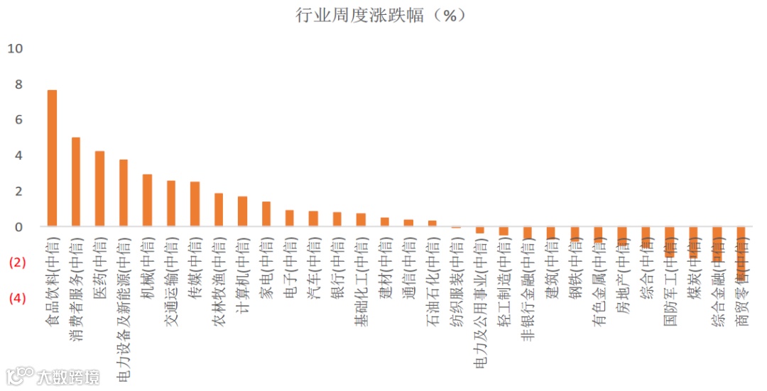 行业方面, 涨跌互现,涨幅前三的行业分别是食品饮料、消费者服务和医药行业。( Wind,申万一级行业)