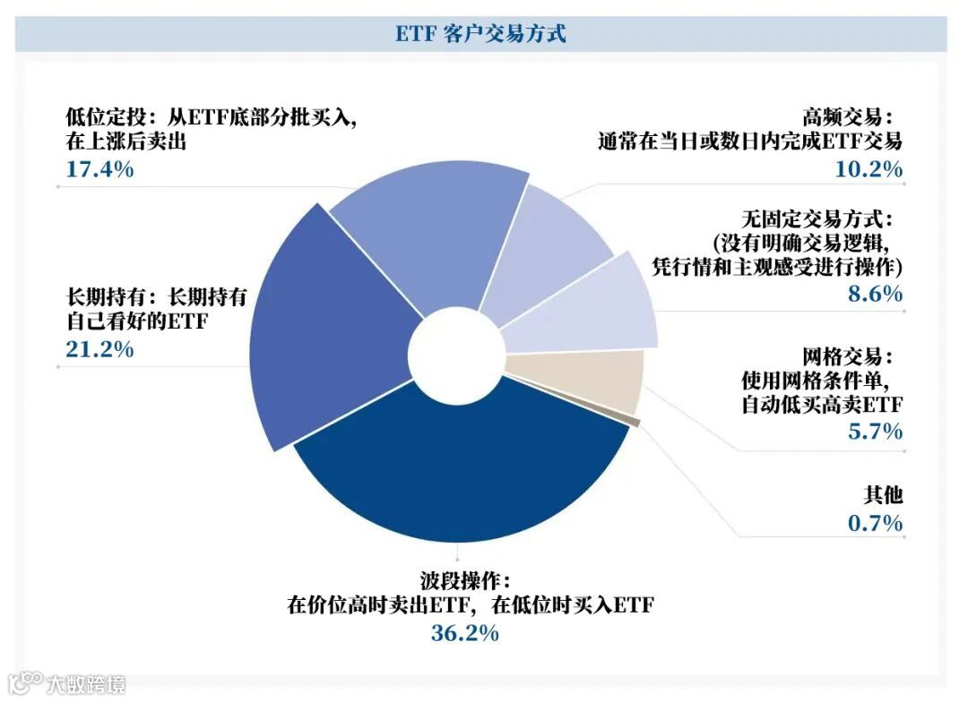 根据报告的调研,波段、长期持有和定投是投资者主要采取的ETF投资策略,分别占比36.2%、21.2%和17.4%。此外,也有相当部分投资者采取了更为专业的高频交易和网格交易。