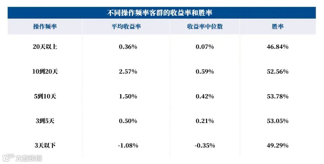 不过,过于短期、择时的交易方式并未带来赚钱效应的提升——平均持有时长在7天内的客户胜率低于50%,明显低于其他时长段;而持有时长在120天以上的客户胜率超过了60%。整体来看,适当拉长持有时间能在一定程度上提升投资胜率。