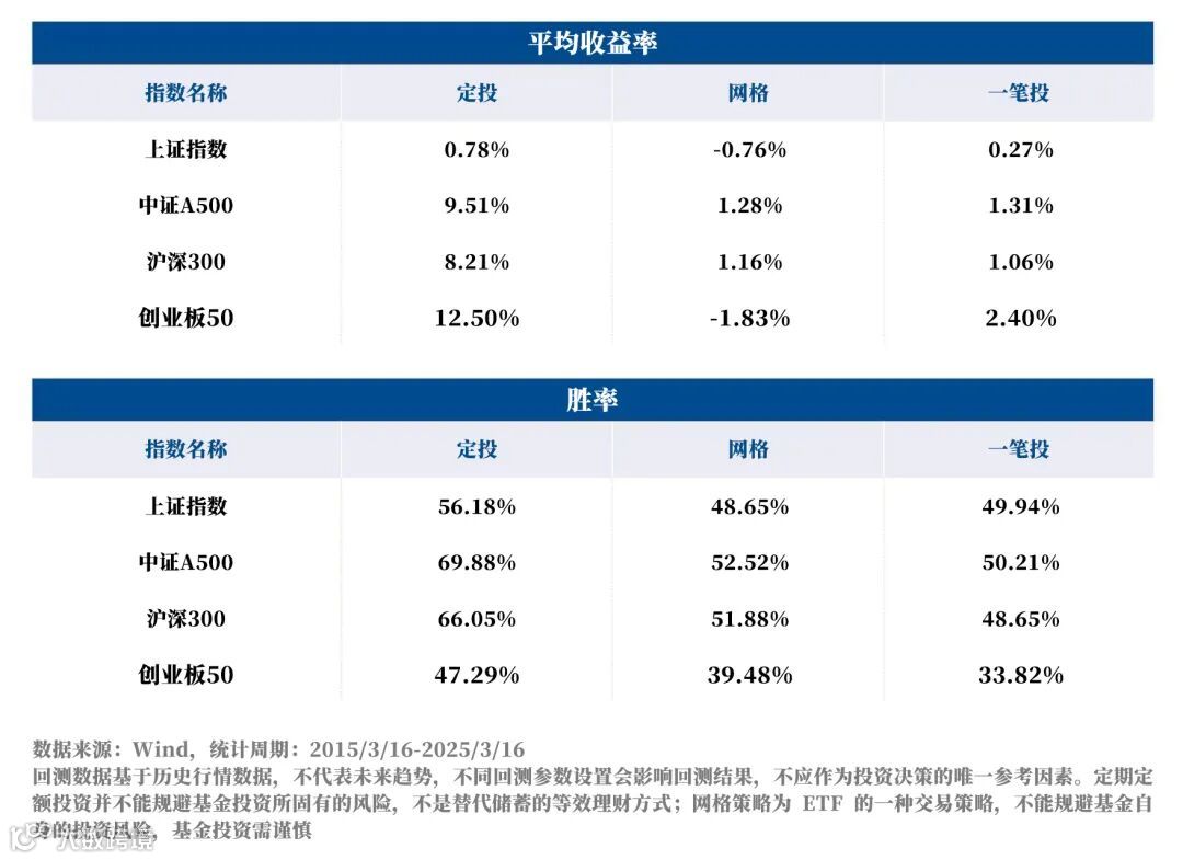 数据来源:Wind,统计周期:2015.03.16-2025.03.16。不同策略的统计口径为:一笔投:a年b月c日买入一笔,持有到a+1年b月c日(如果当日不是交易日,就计算至下一个交易日);定投:a年b月c日(当日为星期x)买入一笔,并于接下来每个星期x都等额加仓一笔,一直到a+1年b月c日;网格:a年b月c日买入一笔(金额为3a),设定上下网格n%,当价格涨到上次交易价格的1+n%时,卖出一份额(金额为a),跌到上次交易价格的1-n%时,买入一份额(金额为a)。以此类推,直至a+1年b月c日收盘。在回测模型中,采用了5%、10%、20%这三个常用的网格区间,进行分别测算。