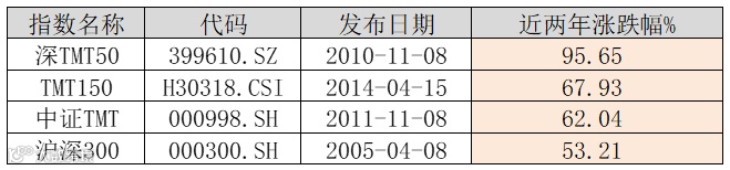 相对于其他三个行业来说,「TMT」一词由于其自带“洋气”的外形和“高大上”的气质,很多小伙伴还不知道它到底是什么。其实,「TMT」是科技Technology、媒体Media、电信Telecom三个单词的首字母缩写。科技、媒体、电信相互融合,正如刘关张桃园三结义,一方面使得传统媒体日益式微。另一方面,三者又共同创造出了新媒体时代,“网红经济”大行其道。在沪深A股中,追踪TMT行业的深TMT50、TMT150、中证TMT指数,在近两年内的涨幅均跑赢了沪深300指数,其中深TMT50近两年涨幅达到了95.65%!