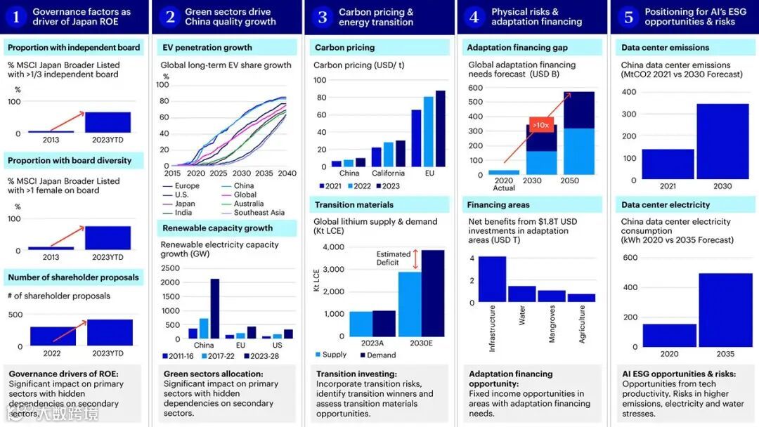 资料来源:RIMES,摩根士丹利研究部 (2023Q3); 摩根士丹利资本国际公司、FactSet、彭博社;彭博新能源财经 (EVO报告2022 | 彭博新能源财经 | 彭博金融资讯 (bnef.com)); 国际能源署(可再生能源2023 (windows.net);伍德麦肯兹,公司文件,瑞银集团估计。; 国际碳行动伙伴关系组织(津贴价格探索者|国际碳行动伙伴关系(icapcarbonaction.com));中国水资源危机及中国ICT转型;数据中心杂志(中国数据中心到2035年用电量将增加222% |数据中心杂志) 。