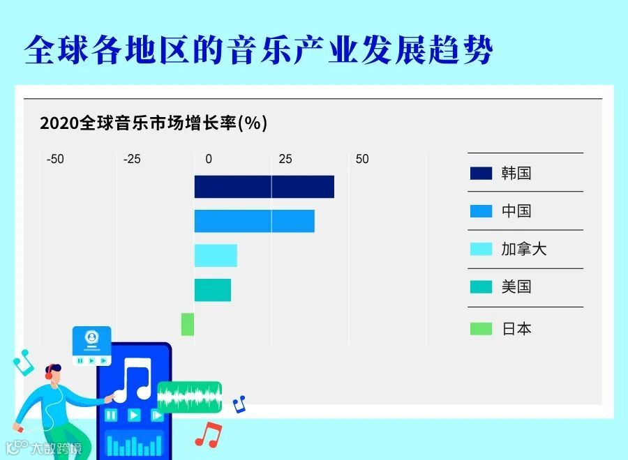 亚洲音乐市场实现了9.5%的增长,比前一年(3.9%)增长强劲很多。值得注意的是,日本在2020年持续下滑,同比下降2.1%,但与此同时,K-POP(韩国流行音乐)的破纪录,也推动了韩国音乐市场的增速达到44.8%,成为2020年增速最快的主要市场。也就是说,曾作为亚洲最大音乐市场的日本,正逐渐褪去光环;而韩国也迅速带着压倒性的涨势,带动该地区的音乐市场。