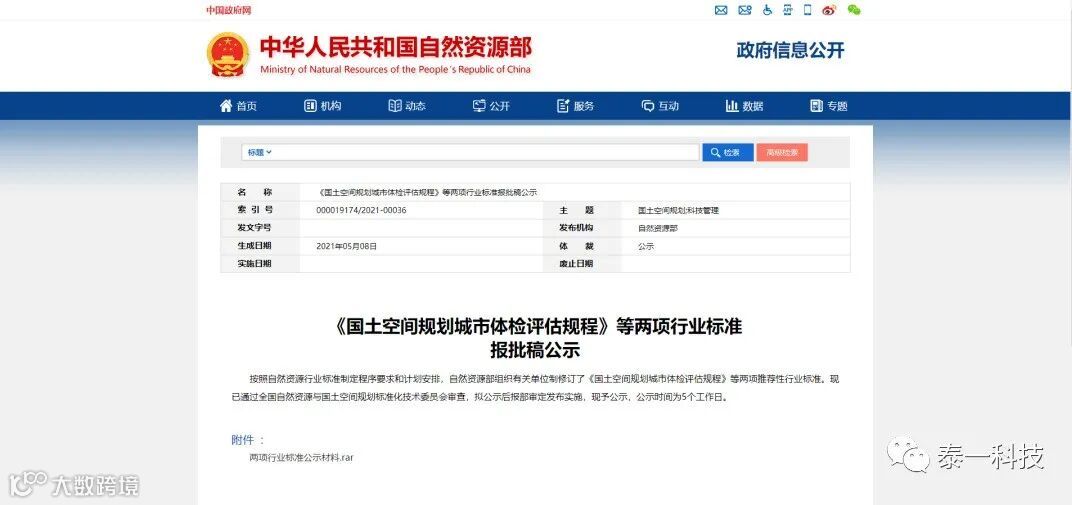 按照自然资源行业标准制定程序要求和计划安排,自然资源部组织有关单位制修订了《国土空间规划城市体检评估规程》等两项推荐性行业标准。现已通过全国自然资源与国土空间规划标准化技术委员会审查,拟公示后报部审定发布实施,现予公示,公示时间为5个工作日。