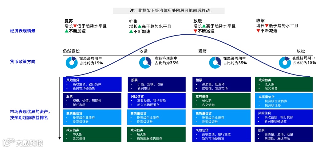 仅作说明用途。我们将“政策放松”定义为美联储正在降低利率和/或扩大资产负债表规模。“仍然宽松”表明美联储正在维持低利率政策和/或继续执行债券购买计划。“收紧政策”表明美联储正在缩减资产购买规模和/或开始加息。“紧缩政策”表明美联储正在加息以缓解通胀担忧。上述趋势仅供参考,无法保证未来一定会持续。