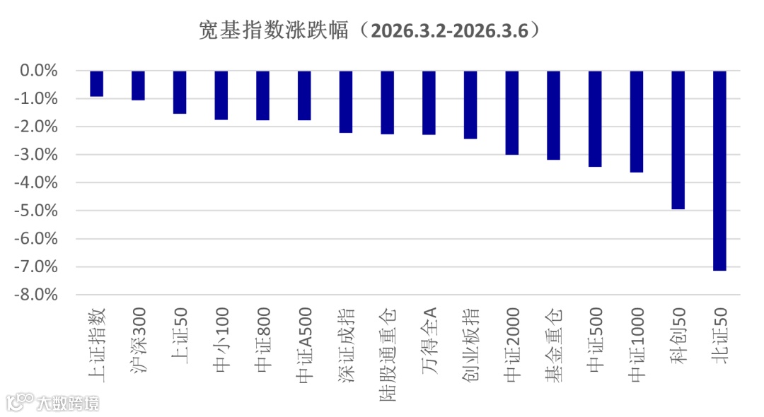 上周A股呈现宽幅震荡走势,外围的地缘政治带来的预期波动较大,随着美伊冲突的升级,市场开始对此进行更多定价,油价上升和需求抑制的预期开始增强,导致指数波动范围加剧。主要宽基指数中,上证指数、沪深300和上证50指数表现相对较好,跌幅分别是0.9%、1.1%和1.5%,科技和小盘股跌幅较大,北证50跌幅达到7.1%,科创50跌幅为4.9%,中证1000、中证500跌幅均超过3.4%。市场避险特征明显,蓝筹股更抗跌,市场成交放大,当周万得全A日均成交2.6万亿。