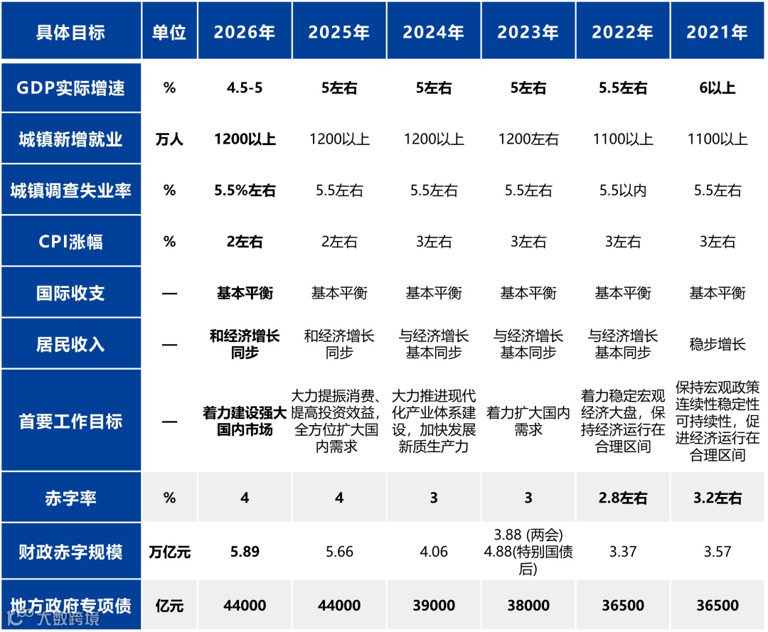 上周国内两会如期召开,《政府工作报告》制定了2026年的经济工作目标,具体数据如下表所示。2026年GDP的增速目标为4.5-5%,数据的制定符合预期。从目前各省公布的经济增速目标来看,加权增速也较2025年有所下降。从中长期目标来看,如果完成2035年远景目标,即GDP相较2020年翻一番,则未来的平均增速达到4.17%即可,市场已经预期经济增速逐步回落,4.5-5%的经济目标符合预期,相较于2025年,实现增长目标的压力也在减小。在这种预期下,财政的开支压力也会减小,所以在稳定赤字率目标之下,专项债规模也保持稳定,以旧换新的规模也适度压减。整体来看,国内货币和财政保持稳定,经济有望平稳运行,权益市场已经对此充分定价。