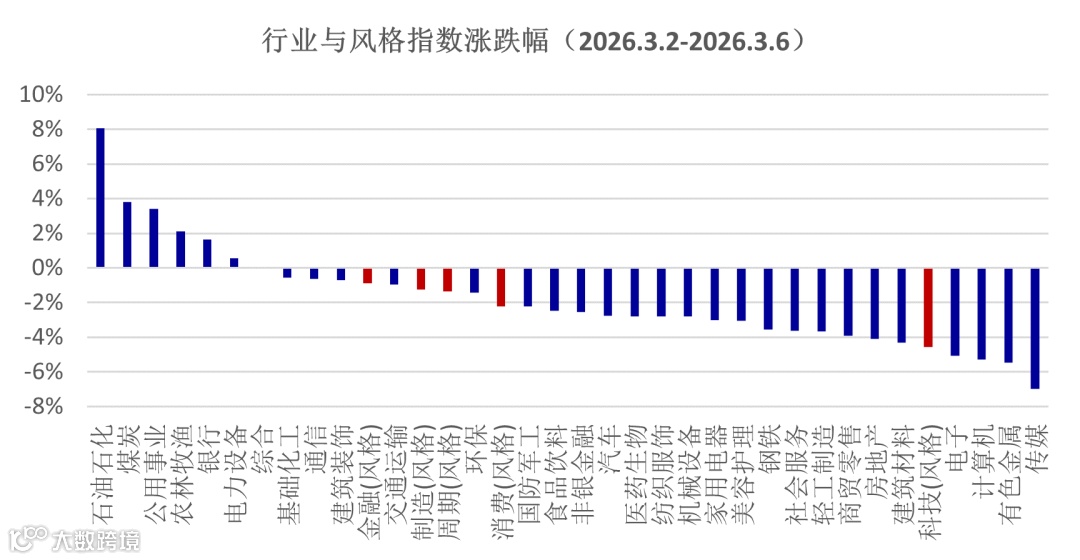 地缘冲突具备较强的不确定性,市场也在进行预期调整。美伊冲突刚爆发时,市场对于战争的情形未能一致预期,而是在油价的带动下推动指数上涨,上证指数收盘价创下本轮新高。但随着美伊冲突的升级,尤其是中东地区更多的地区卷入争斗,投资者开始重新评估美伊战争带来的影响。霍尔木兹海峡的通行受阻,导致油价持续攀升,截止上周五收盘,布伦特原油已经达到93.3美元/桶,由此引发市场对于通胀带来的需求抑制,若市场进入滞胀阶段,则对全球经济的影响都会加剧,因此,我们观察到除了能源板块表现强势,其余板块的调整压力均在增加。