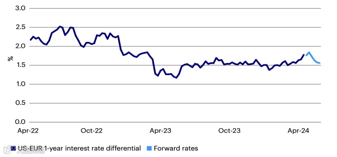 鉴于宏观结果的背离,市场已经开始越来越多地对美联储和欧洲央行的利率政策之间的差异进行定价。图3显示了1年期美元掉期利率与欧元隔夜指数掉期(OIS)利率之间的差异,其中浅蓝色线代表了未来五年的远期定价。2024年迄今,美国与欧洲的利率差异已经扩大约30个基点,因为市场已经对美联储的降息进行了定价,而对欧洲央行政策的市场定价基本保持不变。