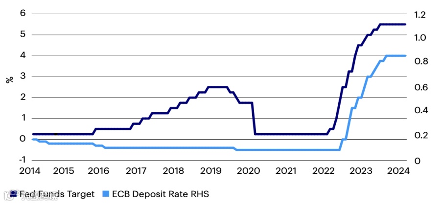 美国在经济增长方面已经超越了欧洲。欧洲在疫情期间复苏较为温和,美国的经济却稳步扩张。然而,欧洲的通货膨胀率下降得更快;欧洲的通货膨胀率最初居高不下,但现在几乎回到了目标水平。