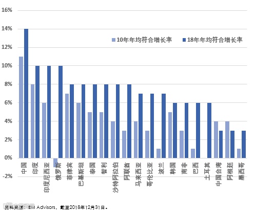 毋庸置疑,中国是近四十年来新兴经济体真正的发展引擎。尽管受到外部需求萎缩的严重冲击,过去 10 年来中国一直保持着 11% 的名义复合增长率 (CAGR),而 2000至2018 年间的 CAGR 为 14%。