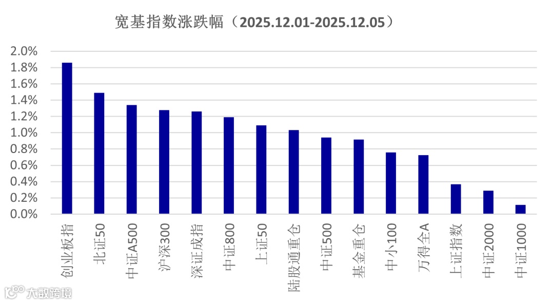 上周A股市场前期维持小幅震荡,周五在金融板块的带动下强势反弹,主要宽基指数均呈现上涨态势。从指数的表现看,创业板指数和北证50指数涨幅最大,分别是1.9%和1.5%,小盘股表现较弱,中证1000指数和中证2000指数涨幅垫底,全周仅上涨0.1%、0.3%。市场成交继续缩量,万得全A日均成交1.70万亿,较上一周日均1.74万亿有所缩小。融资余额维持在2.46万亿水平。