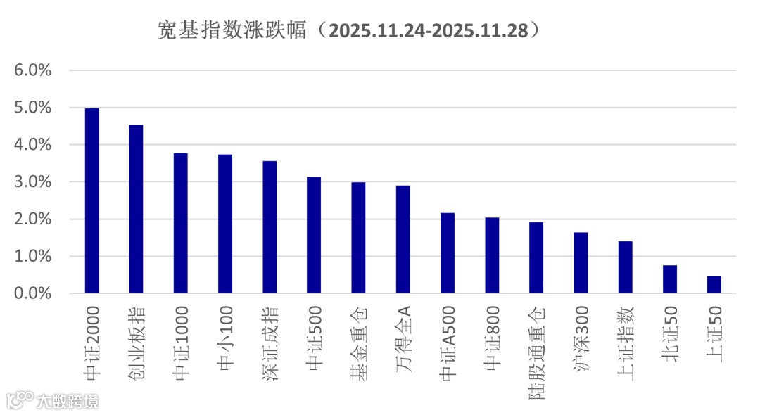 上周A股市场小幅探底后逐步回升,全周主要的宽基指数均呈现上涨态势,结构与前一周呈现明显反转。跟踪的主要指数中,中证2000指数和创业板指数涨幅最大,分别为5.0%和4.5%,其次是中证1000指数、中小100指数和深证成指,涨幅均超过3.5%,上证50指数涨幅最小,为0.5%。市场成交继续缩量,万得全A日均成交1.74万亿,较上一周日均1.87万亿有所缩小。融资余额小幅回升至2.47万亿。