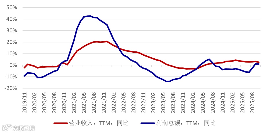 上周统计局公布了10月份的工业企业利润数据。从累计同比数据看,规模以上的工业企业营收和利润增速为1.8%和1.9%,较上个月的2.4%和3.2%有明显的下降。考虑到季节性因素,我们用滚动12个月的TTM数据进行测算,测算结果表明,营收增速从3.19%下降至2.61%,而利润增速从0.99%小幅回升至1.01%。