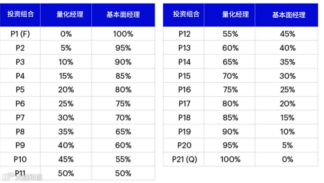 •我们将从一个既选择基本面经理又选择量化经理的假设资产所有者的角度来研究。为了明确经理选择的效用与权重分配效应,我们将为这两种情况进行分析:一种是基于中位数业绩的经理(“基准情形”),另一种是基于前四分之一业绩的经理(“高业绩情形 ”)。