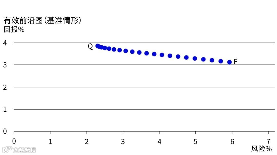 在整个研究期间,100%投资于基本经理的投资组合F具有最高的回报,但也具有最高的风险。随着投资组合配置向量化经理转移(有效前沿的左下方),投资组合的收益和风险单调下降,直到我们达到投资组合Q,它的收益最低,但风险也最低。