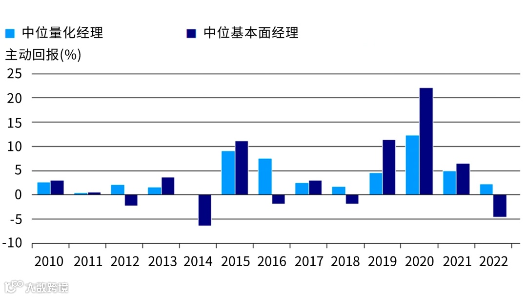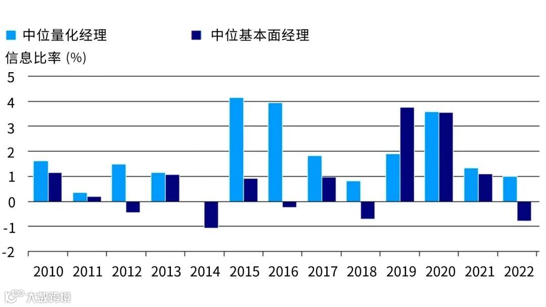 图 1 - 中位量化经理的表现较中位基本面经理优胜