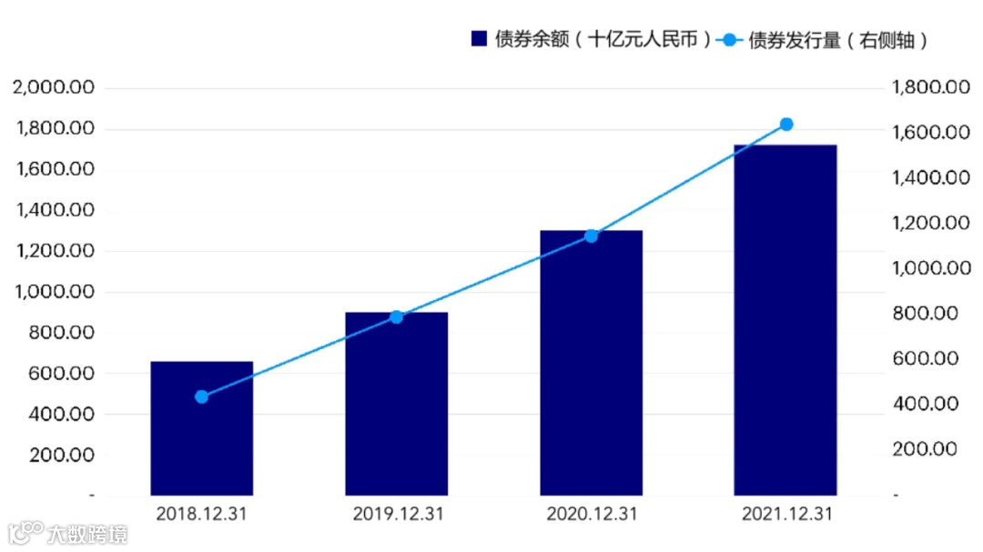 ●中国拥有全球第二大的绿色债券市场,绿色债券余额在2021年底超过一万亿元人民币,并呈现持续高增长态势(见图3)。