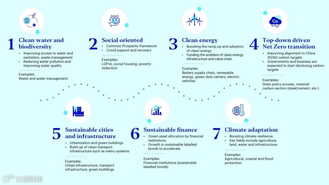 在可持续债券投资为例,景顺重点关注中国市场在以下七个方面的投资主题和领域:清洁水源和生物多样性、社会价值导向 、清洁能源、自上而下的净零转型、可持续城市和基础设施、可持续金融、气候适应(见图4)。