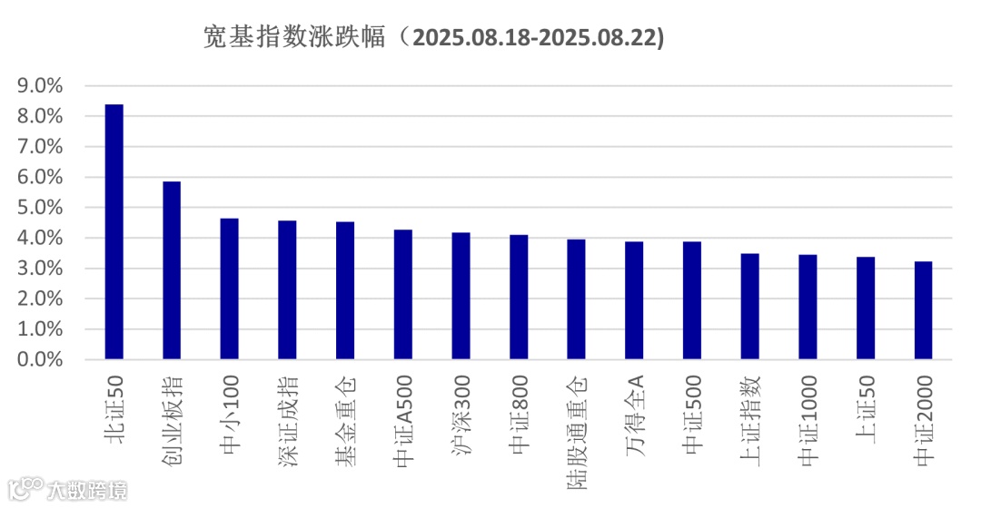 上周上证综指继续向上突破,周五在科创板的带领下突破3800点,达到3825.76点,创下2016年以来的新高。北证50指数周涨幅最大,达到8.4%,其次是创业板和中小100指数,涨幅分别是5.9%和4.6%,其余指数表现差别不大,中证2000指数涨幅较小,但也上涨了3.2%。市场的活跃度进一步提升,上周万得全A指数日均成交达到2.59万亿,较前两周有明显的放大,融资余额也进一步攀升,达到2.14万亿。