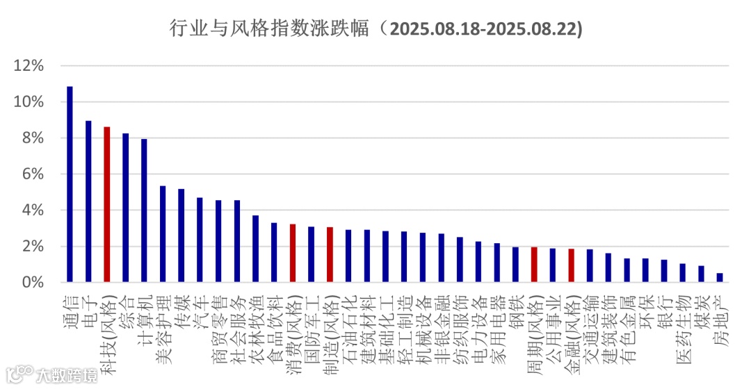 行业指数继续呈现出高弹性特征,科技成长板块领涨,通信、电子继续领涨,单周10.8%、9.0%,同属TMT板块的计算机、传媒也上涨了7.9%和5.2%,显著跑赢沪深300指数。在国产算力新叙事之下,以龙头芯片代表的“自主可控”开启估值提升行情。市场定价提升的板块,是科技产业趋势和高景气方向,代表的是国产算力和稀土小金属。在指数冲关之下,互联网金融及券商作为景气方向之一亦跑出超额。二季度公募和市场增配较多的银行阶段性表现较弱,风险偏好抬升之下,弱弹性的标的阶段性表现不强,此类板块或仍有绝对收益空间。周期板块表现同样较弱,市场担心GDP增速在三季度开始回落,且宏观总需求并未明显扩张,反内卷是否带来行业格局优化,仍需要产销数据的验证。