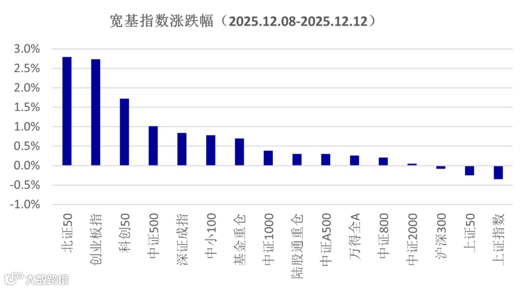 上周国内中央政治局会议和中央经济工作会议陆续召开,对未来政策做了指引,美国美联储降准落地但市场对后续货币政策有分歧,受此影响A股市场整体维持震荡走势,科技板块表现更强,蓝筹股表现稍弱。主要的宽基指数中,北证50指数、创业板指数、科创50指数表现较好,涨幅均超过1.7%,中证500指数也上涨了1.0%,而上证指数、上证50以及沪深300指数均为下跌。市场成交量有所回升,万得全A日均成交1.95万亿,上一周日均1.70万亿。融资余额为2.50万亿,较前一周明显回升。