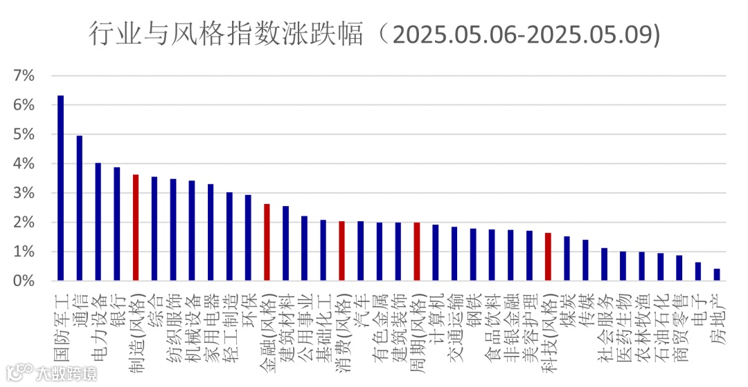在外围地缘冲突影响之下,国防军工表现突出,周涨幅达到6.3%;其次是受到人工智能产业周期带动的通信板块,尤其是光模块相关个股表现突出。房地产指数表现较差,一方面是基本面维度的压力,商品房的销售开始显现压力,预计5月份销售面积同比继续负增长;另一方面市场对于现房销售的预期有所提升,这会压制房地产开发商的盈利能力。预计二季度经济压力较一季度增大,反映在基本面上,包括地产链在内的周期相关板块,均有业绩压力,谨慎对待。从一季报的业绩情况分析,景气方向集中在消费、医药和科技,目前阶段科技相对具备性价比,机器人微观结构相对较好,相关主题弹性或有延续性。