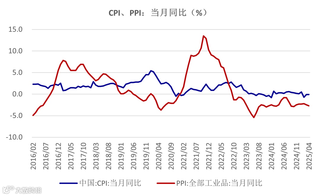 上周统计局公布了4月份的CPI、PPI数据。从数据结构来看,CPI同比较上月持平,环比增速回升0.5个百分点至0.1%;PPI同比增速4月为-2.7%,较3月的-2.5%进一步下降,环比数据较3月份持平均为-0.4%。目前价格的压力依然较大,尤其是工业品,价格环比、同比均为负增长,反映需求端偏弱,尤其是面对美国抬升贸易壁垒,引起全球的需求预期进一步下滑。二季度价格压力或较难有明显改善。