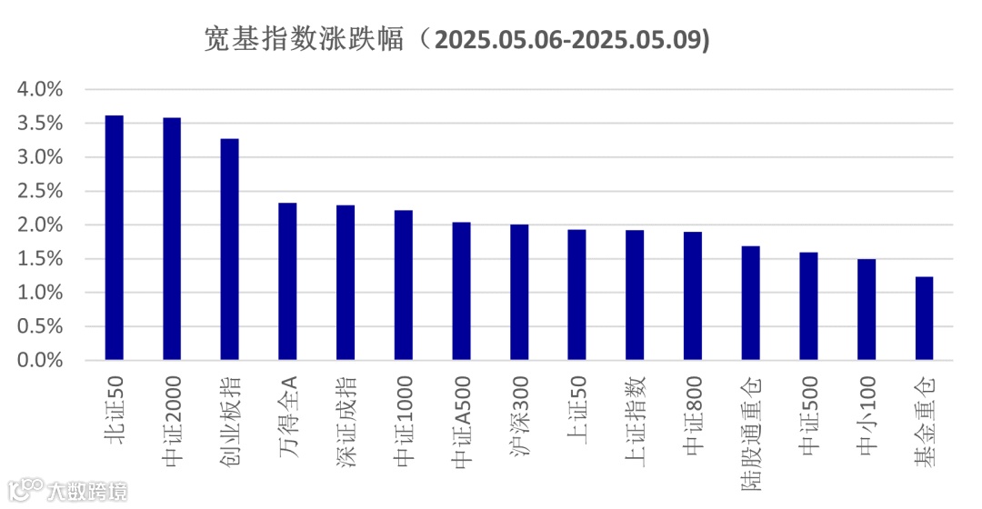 上周A股市场先扬后抑,虽然周五有小幅下跌,但全周主要宽基指数均上涨,小盘股风格表现更好,北证50、中证2000指数均上涨了3.6%,上证指数涨幅1.9%,基金重仓股指数涨幅最弱,为1.2%。海外互联网企业业绩和资本开支催化下,人工智能板块进一步反弹;国内金融政策宽松预期强化,监管层稳定市场的意愿和积极性都得到验证;在此影响下,市场风险偏好回升,成交量放大、融资余额数据进一步反弹。虽然市场对于二季度的经济有所担忧,但在风险偏好和资金预期下,指数有望逐步抬升中枢水平。上周万得全A日均成交额为1.35万亿,节前一周日均为1.10万亿。