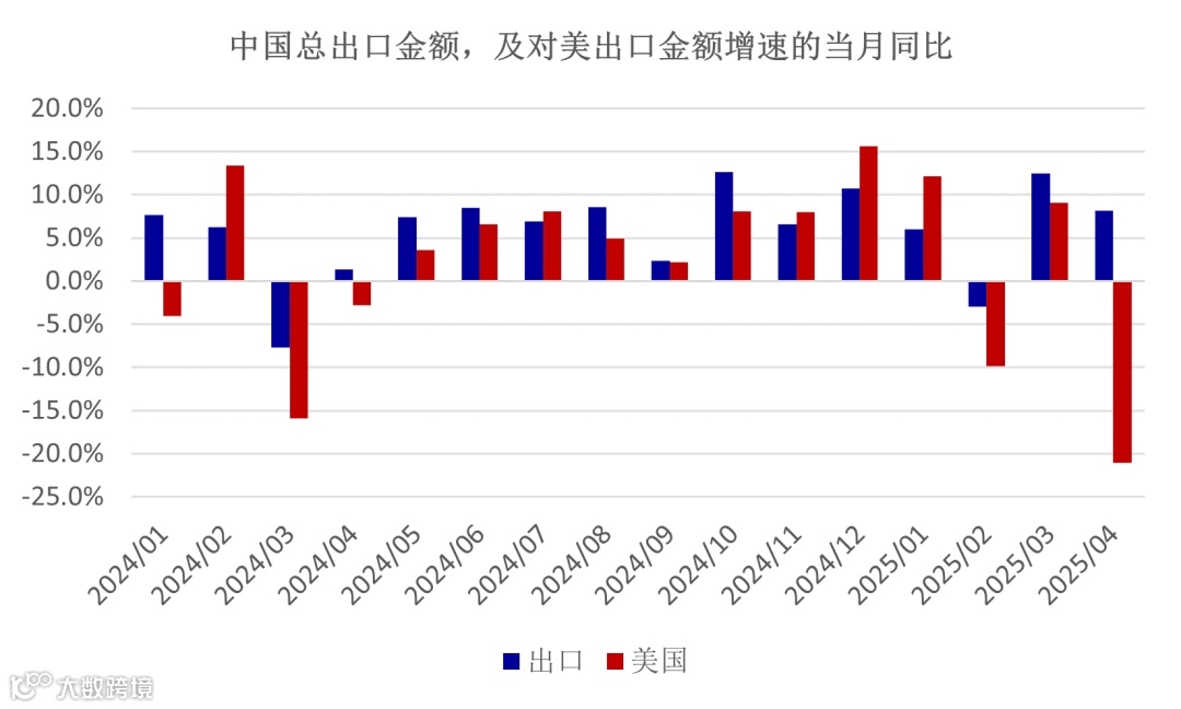 上周海关总署公布了4月份我国的外贸数据。以美元计价的商品金额,4月份出口同比增速为8.1%,较3月份的12.4%有所下降,进口金额增速为-0.2%,较3月份的-4.3%有所改善。从滚动12个月的累计值测算,出口增速从3月份的6.9%上升至4月的7.4%,而进口则从-1.0%下降至-1.7%。出口增长的情况和进口回落的趋势仍未改变。值得注意的是,我们对美国的单月出口增速,从3月份的9.1%回落至4月份的-21.0%,美国关税政策的影响开始显现。