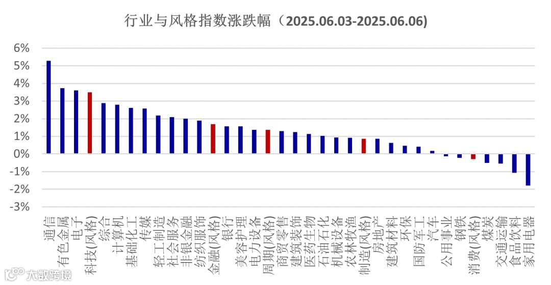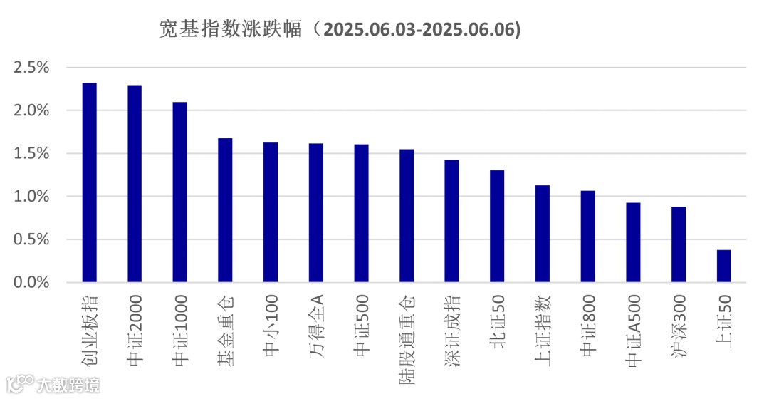端午节后A股市场交易情绪有所修复,上证指数连续四天阳线收涨,宽基指数中,创业板指数和中证2000指数表现最好,均上涨了2.3%,上证50表现稍弱,涨幅为0.4%,市场呈现出小盘股和成长更强的风格特征,与风险偏好的回升表现一致。
