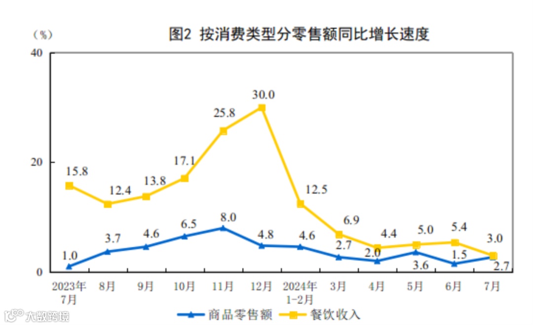 按照消费类型,社零分为商品零售和餐饮收入,2024年1-7月份,商品零售额243079亿元,同比增长3.1%;餐饮收入30647亿元,同比增长7.1%。