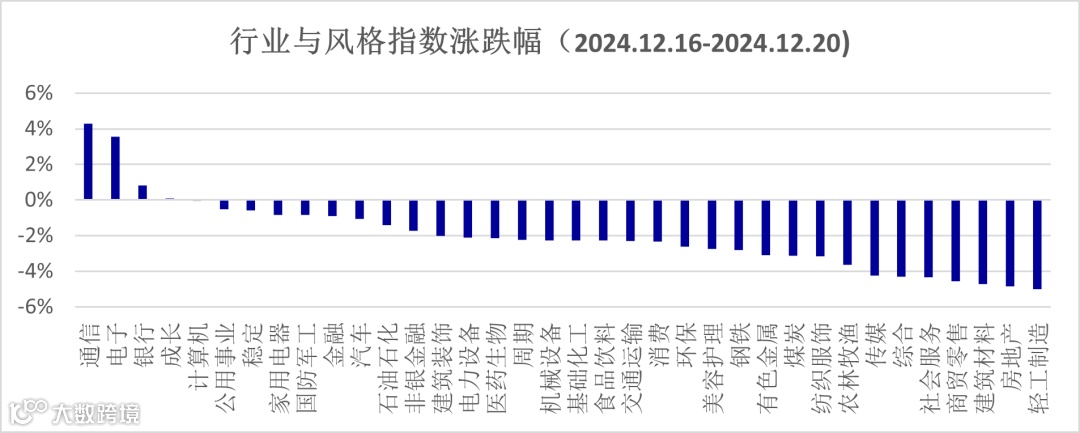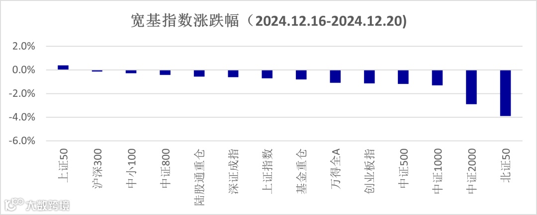 上周市场震荡下行,上证综指下跌0.7%,主要宽基指数中仅上证50指数小幅上涨0.4%,小盘股板块跌幅较大,北证50指数继续下跌,跌幅达3.9%,中证2000和中证1000指数跌幅也较大,市场情绪回落,小盘股对此反映更为明显。回顾上周市场,内外因素对基本面和流动性均有冲击,国内投资数据和消费数据出炉,固定资产投资数据累计增速下降0.1个百分点至3.3%、社会消费品零售总额增速11月当月同比3.0%,较10月份增速4.8%回落明显。海外方面,美联储如期降息但表态偏鹰,市场调整2025年美元降息预期,美股在降息日跌幅较大,受此影响,港股和A股均有回落。市场交易活跃度下降,万得全A指数日均成交额从前一周的1.9万亿回落至1.5万亿。