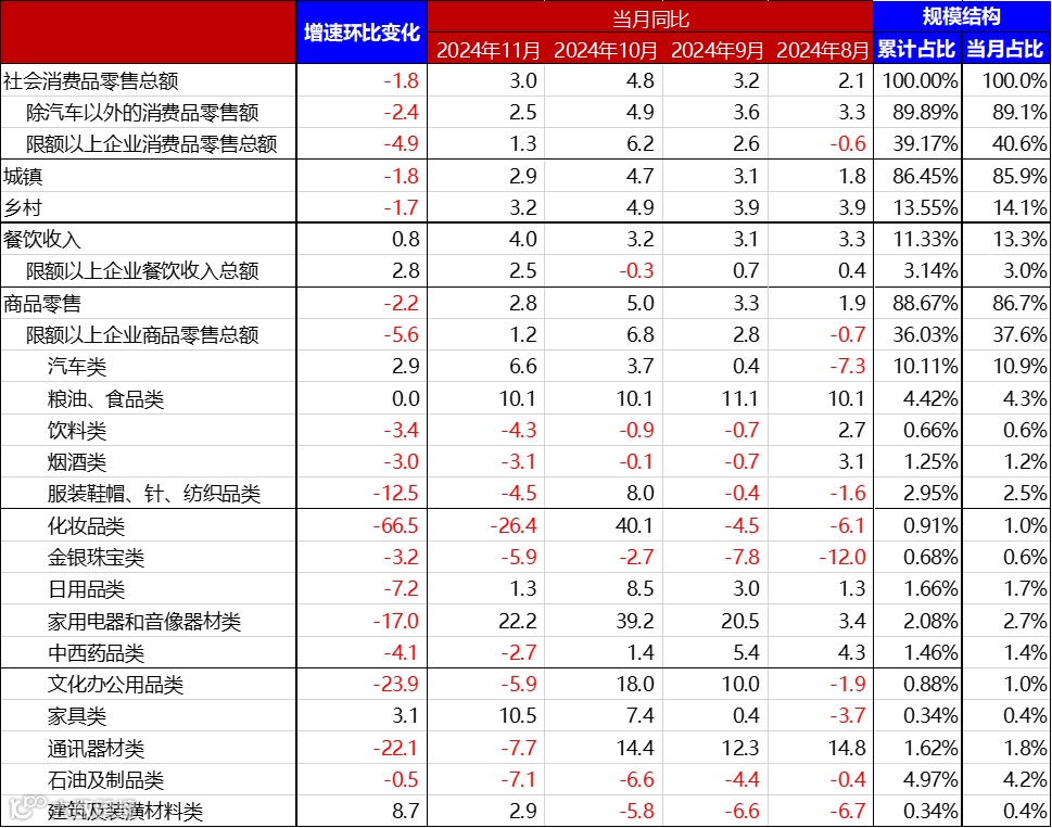 消费方面,社会消费品零售总额11月增速3.0%,餐饮和汽车保持增速回升,增速分别为4.0%、6.6%,均高于零售总额增速。其余大部分品类的增速都有下降压力,其中家电类销售月度同比从10月39.2%,回落至11月的22.2%。2024年的消费品补贴政策,对于零售总额的增长有较大贡献,但短期看效果的持续性仍然需要观察。目前投资者预期2025年会迎来更大规模的刺激力度,消费板块在此政策上的博弈较为明显。