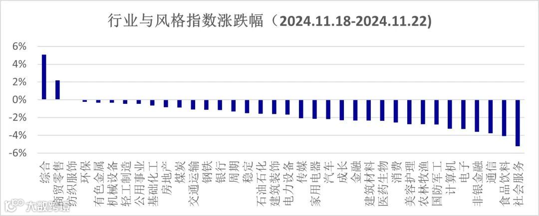 从行业角度观察,分化同样较为明显,综合和商贸零售指数分别上涨5.08%、2.18%,而社会服务和食品饮料行业跌幅分别达到5.24%和4.08%。高弹性的TMT行业和非银金融行业跌幅较大,市场在回调过程中,显示出高弹性板块较大的波动性,而红利资产跑赢市场。