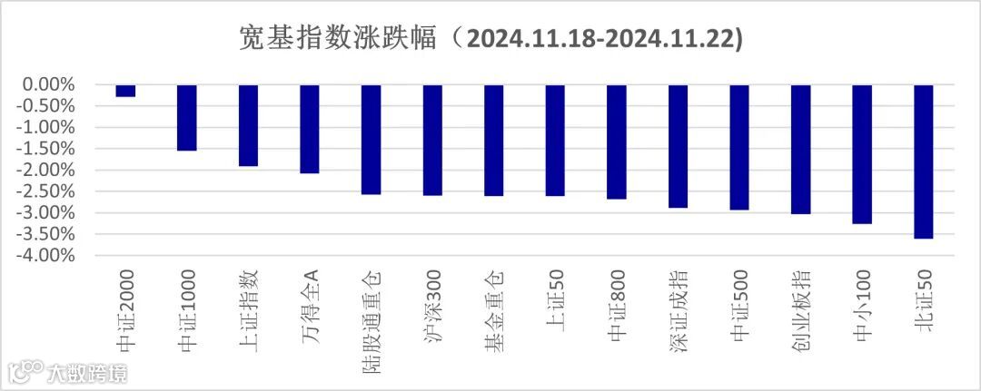 上周市场前期呈现震荡回升态势,但周五主要指数均大幅回落,前四交易日上证综指上涨1.19%,周五下跌幅度达到3.06%,全周下跌1.91%,市场整体成交活跃度下降,万得全A指数日均成交额从前一周的2.2万亿下探至1.7万亿。宽基指数集体下跌,指数分化开始加大,中证2000跌幅较小,周跌幅为0.29%,北证50指数跌幅为3.61%。