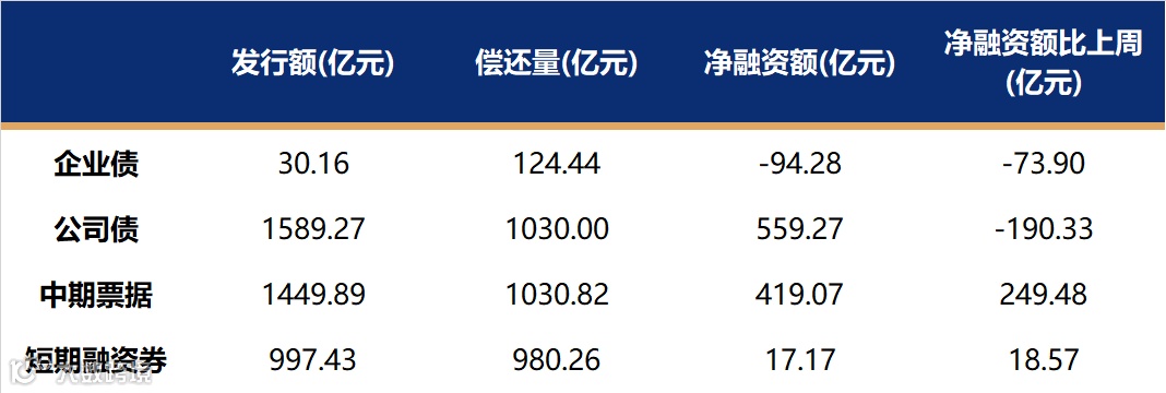 非金融企业短融、中票、企业债、公司债发行量、偿还量、净融资额(与前一周比较)。